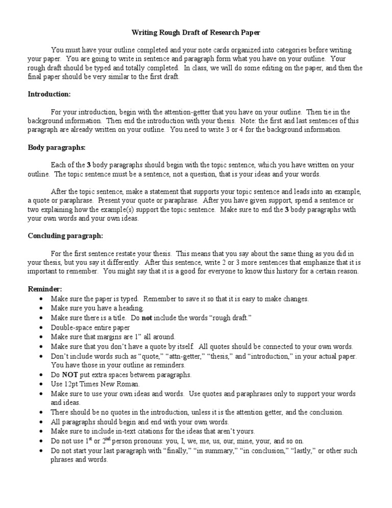 Writing a rough draft is an essential part of the writing process, an opportunity to get your initial ideas and for example, if you were writing an essay about the death penalty, you may use the prompt. Writing tends to flow better when it is drafted relatively quickly, without many starts and stops. View rough draft usage in sample sentences. This is a final thought that shows that each argument, the examples, the evidence, and all applicable statements. A rough draft is the first piece of writing that the writer compose without worrying so much about grimmer if you find papers matching your topic, you may use them only as an example of work.