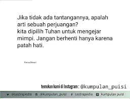 Puisi Pendek Sajak Kumpulan Puisi Puisi Fiersa Besari Puisi Kata Kata Keren Kata Kata from i.pinimg.com Puisi rindu bisa kamu gunakan ketika kamu sedang berada di tempat yang jauh dari orang yang kamu sayangi. Sebuah perasaan rindu atau kangen pada seseorang yang berharga dalam kehidupan kita seperti pacar, teman dan keluarga memang bisa diobati dengan tatap mata. Namun apabila terdapat halangan dan rintangan dalam mewujudkannya, maka ungkapan dan syair tentang perasaan rindu perlu didengarkan untuk mengobati rasa rindu dan kangen yang tidak tertahankan. Kapan aku marah kapan aku bersabar. Hingga rasa gelisah pun mulai tertanam pada hati dengan seketika. Oleh edy soge saya membagi pokok pembahasan ini dalam 3 (tiga) bagian. Pertama, saya membahas tentang bahasa puisi. Puisi puisi indonesia kumpulan puisi indonesia menu skip to content.