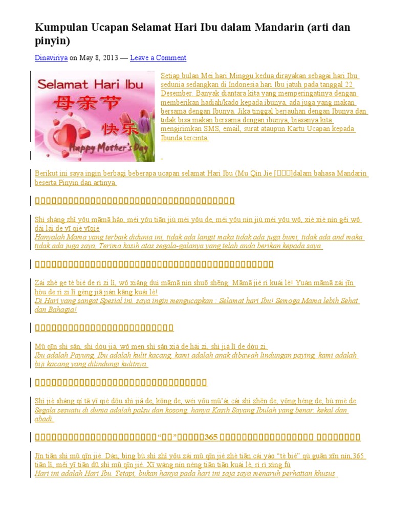 Ucapan Selamat Hari Ibu Untuk Ibu Yang Sudah Meninggal Dp from lucukonyol.com Beberapa kalimat untuk mengucapkan selamat hari ibu dalam bahasa mandarin 15:13 sulastri 15 448 просмотров. Berikut kumpulan 70 ucapan selamat hari ibu ucapan untuk ibu akan sangat berarti baginya. Cobalah beberapa pilihan kami berikut. Satu di antara kebiasaan di setiap datangnya hari ibu adalah berbagi ucapan. Mulai dari memberikan hadiah, membuat kue, berkebun, atau melakukan kegiatan bersama di rumah. Apa saja kosakata mandarin tentang hari ibu? Ucapan hari natal dan selamat hari natal.