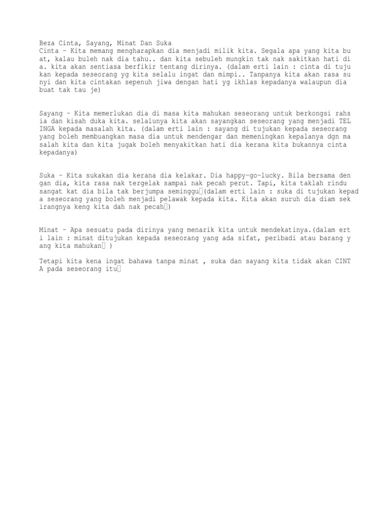 Cinta dan sayang itu adalah hal yang berbeda. Read cinta dan sayang from the story our story by nadhirahrahman (dewi dira) with 40 reads. Tapi sebetulnya, cinta dan sayang itu sendiri memiliki makna yang berbeda. Entry tu pasal beza antara cinte, sayang, minat ngn suke. Jom kenali apa sebenarnya maksud setiap perasaan tersebut… cinta memang mengharapkan dia menjadi milik kita.