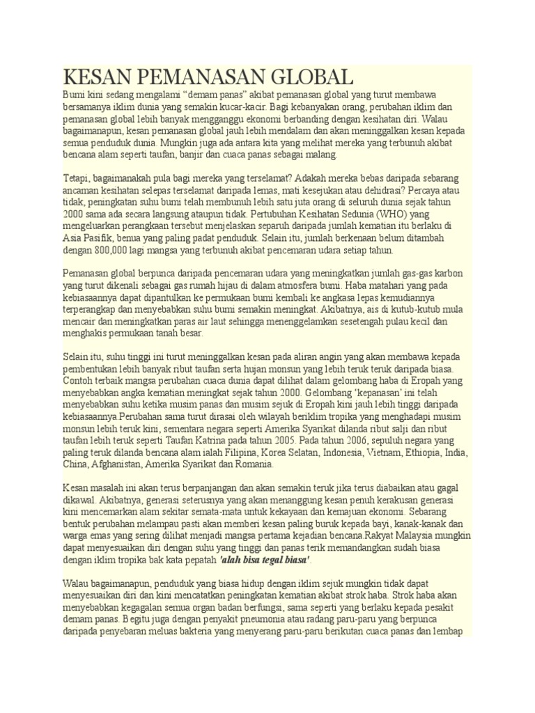 Isu Pemanasan Global Apakah Punca Dan Kesannya Smk Penghulu Saat from smkpenghulusaad.files.wordpress.com Kenaikan air laut akibat pencairan ais berupaya memberi dampak yang dahsyat seperti kejadian banjir besar. Meneduhkan jalan sehingga panas berkurang c. Walau bagaimanapun, kesan pemanasan global jauh lebih mendalam dan akan meninggalkan kesan kepada semua penduduk dunia. Penyebab pemanasan global ini disebabkan oleh aktivitas manusia sendiri, semakin padat nya penduduk yang ada di seluruh dunia dan populasi manusia terus bertamabah maka jumlah kendaraan bermotor juga akan selalu bertambah. Ini akan menyebabkan pemanasan global secara berperingkat, dan kawasan yang mengalami pencemaran. Apa sih global warming itu? Pembakaran bahan bakar fosil dan penebangan hutan dapat meningkatkan kadar karbon dioksida di atmosfer. Kesimpulannya, pemanasan global yang berlaku akan memberi kesan negatif kepada manusia.